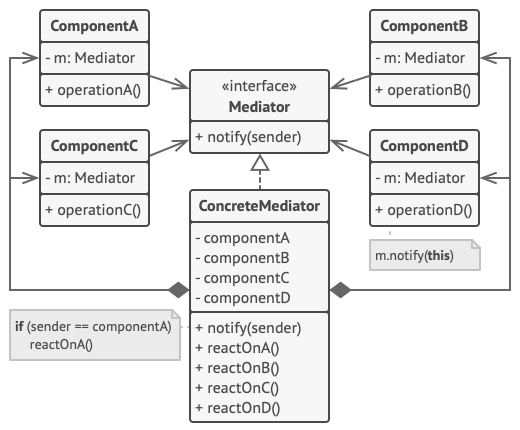 L’interface Médiateur déclare des méthodes pour communiquer avec les composants et n’est généralement dotée que d’une seule méthode de notification. Les composants peuvent passer n’importe quel contexte en paramètre de cette méthode (ce qui inclut leurs propres objets), mais en évitant de provoquer un couplage entre un composant récepteur et la classe du demandeur.