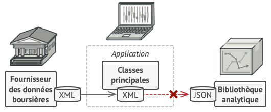 Retournons à notre application de surveillance du marché boursier. Pour résoudre le problème des formats incompatibles, vous pouvez créer des adaptateurs XML vers JSON pour chaque classe de la librairie que notre code veut utiliser. Vous n’avez plus qu’à ajuster votre code pour communiquer avec la librairie à l’aide de ces adaptateurs. Lorsqu’un adaptateur reçoit un appel, il convertit les données XML en une structure JSON. Il renvoie ensuite l’appel à la méthode appropriée dans un objet d’analyse encapsulé.