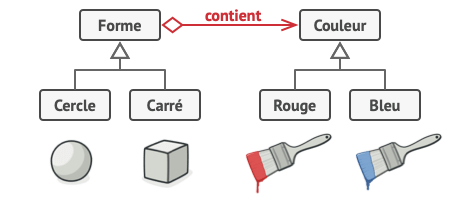Prenons une classe de Forme géométrique avec les sous-classes suivantes : Cercle et Carré. Vous voulez étendre cette hiérarchie de classes pour incorporer des couleurs, vous créez donc des sous-classes de formes : Rouge et Bleu. Mais vous avez déjà deux sous-classes, vous devez donc créer quatre combinaisons comme par exemple CercleBleu et CarréRouge.