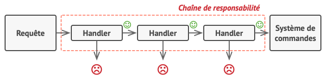 Ce patron vous permet de former une chaîne avec les handlers et d’interroger chacun d’entre eux lors de la réception de la demande afin de savoir s’ils peuvent la traiter. Chaque handler a ainsi l’opportunité de traiter la demande.