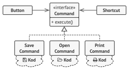 Na początku, gdy nasza aplikacja posiadała tylko pasek narzędziowy, umieszczenie implementacji operacji w podklasach przycisku miało sens. Innymi słowy, trzymanie kodu służącego do kopiowaniu tekstu w obrębie podklasy PrzyciskKopiuj było w porządku. Jednak po zaimplementowaniu menu kontekstowego, skrótów i innych — trzeba duplikować kod operacji w wielu klasach lub uczynić menu zależnymi od przycisków, co jest jeszcze gorszą opcją.
