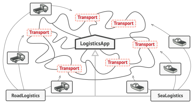 Наприклад, класи Вантажівка і Судно реалізують інтерфейс Транспорт з методом доставити. Кожен з цих класів реалізує метод по-своєму: вантажівки перевозять вантажі сушею, а судна — морем. Фабричний метод класу ДорожноїЛогістики поверне об’єкт-вантажівку, а класу МорськоїЛогістики — об’єкт-судно.