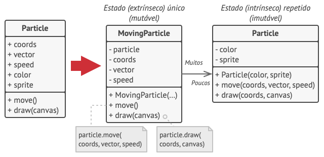 No nosso caso, esse seria o objeto principal Jogo que armazena todas as partículas no campo partículas. Para mover o estado extrínseco para essa classe você precisa criar diversos campos array para armazenar coordenadas, vetores, e a velocidade de cada partícula individual. Mas isso não é tudo. Você vai precisar de outra array para armazenar referências ao flyweight específico que representa a partícula. Essas arrays devem estar em sincronia para que você possa acessar todos os dados de uma partícula usando o mesmo índice.